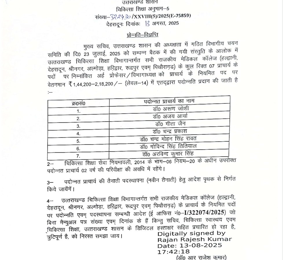 उत्तराखण्ड चिकित्सा शिक्षा विभागान्तर्गत सभी राजकीय मेडिकल कॉलेजों—हल्द्वानी, देहरादून, श्रीनगर, अल्मोड़ा, हरिद्वार, रूद्रपुर एवं पिथौरागढ़—में प्राचार्य के 7 रिक्त नियमित पदों पर योग्य प्रोफेसरों एवं विभागाध्यक्षों को पदोन्नति प्रदान की गई है।